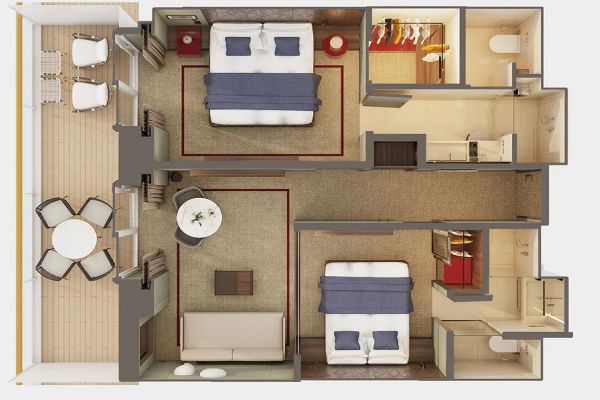 These Suites feature two beds convert to a queen, stunning aft-facing views, can connect. Experience unforgettable aft-facing views from your private balcony and spacious accommodations to spread out. Some connect. Accommodates: 2. Total Approx. Size: 448 sq. ft. Balcony Size: 195 sq. ft.