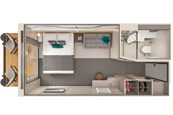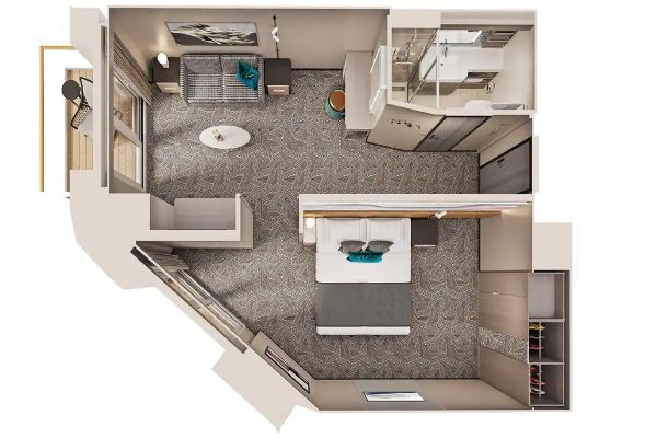 These Suites feature a separate bedroom, double sofa bed, spacious bath, large balcony with forward-facing views. Take in the fresh air and spectacular views from your large, forward-facing balcony and relax in stylish accommodations. Accommodates: 2-4. Total Approx. Size: 412-487 sq. ft. Balcony Size: 153-191 sq. ft.