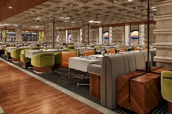 These staterooms feature two beds that convert to a queen and a sitting area, plus some can connect. Floor-to-ceiling glass doors open to a private balcony with sweeping views. Accommodates: 2. Total Approx. Size: 231-358 sq. ft. Balcony Size: 45-69 sq. ft.