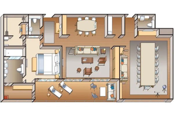 Largest suite on board: 1,448 sq ft including expansive private veranda (multi-room suite). Features: King-size Viking Explorer Bed with luxury linens & pillows, Three 42 flat-screen, interactive LCD TVs with intuitive remote & complimentary Movies On Demand, 110/220 volt outlets & USB ports, Mini-bar with alcoholic beverages, soft drinks, water & upgraded snacks (replenished once daily); security safe; hairdryer, Direct-dial satellite phone & cell service, Large master bathroom featuring a spacious glass-enclosed shower, double-sink vanity, heated bathroom floor & anti-fog mirror, plus two guest bathrooms, Premium Freyja® toiletries; plush robes & slippers, Purified water refilled daily, Stateroom steward & twice-daily housekeeping, 24-hour room service (including service from any restaurant during open hours), Spacious walk-in closet & drawers, Complimentary laundry, dry cleaning, pressing & shoe shine services